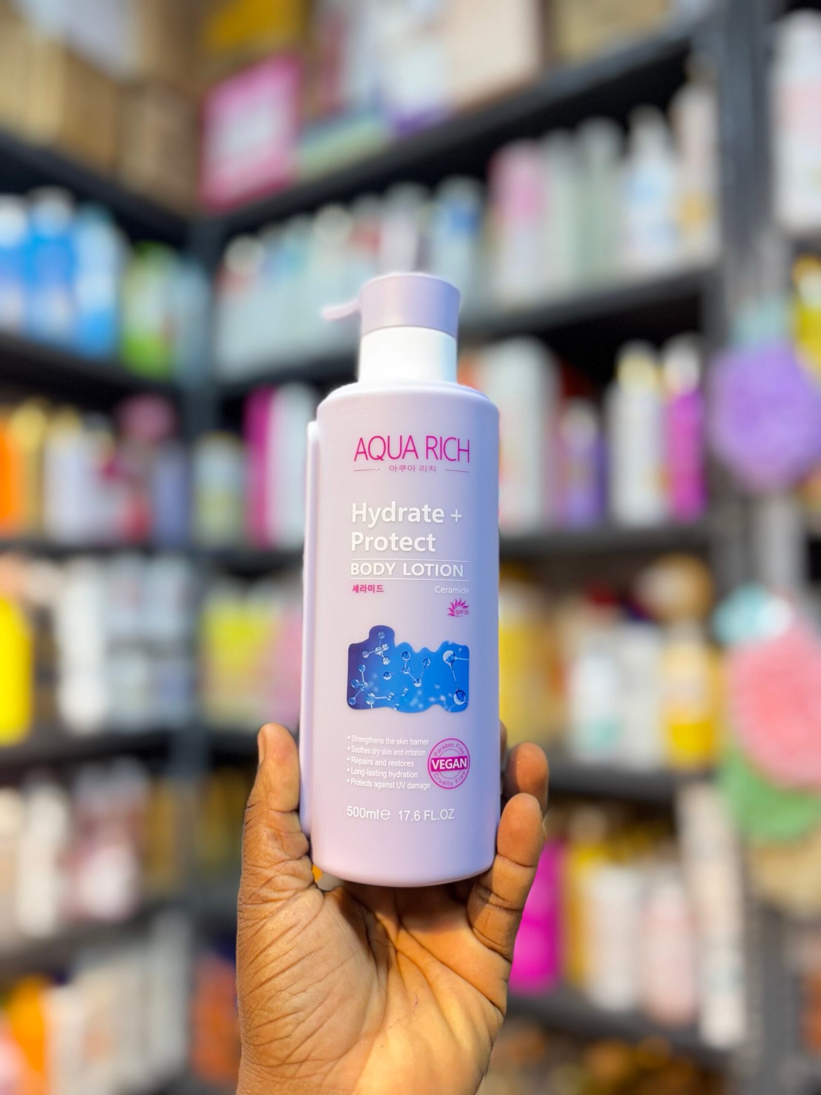 Aqua Rich Hydrate + Protect Body Lotion delivers advanced skin hydration and protection powered by Ceramide and SPF 50. This vegan, paraben-free body lotion helps repair and strengthen the skin barrier, soothe dryness, and shield the skin from UV damage while keeping it soft, smooth, and moisturized all day. Aqua Rich Ceramide Lotion is a body moisturizer focused on deep hydration, skin barrier repair, and protection, often containing ceramides to lock in moisture and strengthen skin, alongside ingredients like glycerin, shea butter, and sometimes SPF 50 for UV defense, leaving skin soft, smooth, and resilient without greasiness. There are variations, including bright formulas with Niacinamide or Vitamin C to even skin tone, all aiming for a healthy glow.