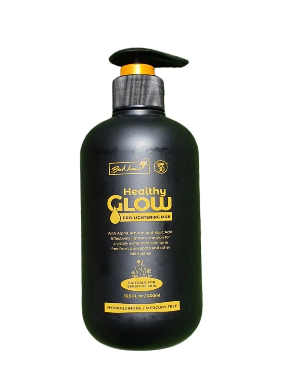 Bio Nature Healthy Glow Pro Lightening Milk is a skin-lightening body lotion designed to brighten the skin, reduce dark spots, and even out skin tone, providing deep hydration and leaving the skin soft and smooth. It typically contains ingredients like Alpha Arbutin and Kojic Acid and claims to be formulated without Hydroquinone or Mercury, while offering sun protection with SPF 30. The non-greasy, fast-absorbing formula is intended for daily use to restore skin radiance and enhance a healthy, luminous glow.  Available at Gifty beauty store in Lagos