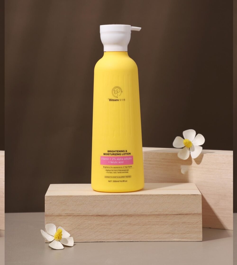 Bitnara’s Brightening Moisturizing Lotion is a lightweight, fast-absorbing formula designed to hydrate, soften, and even skin tone for a radiant, luminous complexion. It contains a powerful blend of ingredients, including Niacinamide, Vitamin C, and Hyaluronic Acid, which work to reduce dullness, fade dark spots, protect against environmental damage, and lock in moisture for smooth, supple, and refreshed skin. The lotion is suitable for both face and body and is ideal for daily use to enhance skin clarity and radiance. Gifty beauty store Transform your daily skincare routine with the Bitnara Brightening & Moisturizing Lotion. Specially formulated with Vitamin C, 2% Alpha Arbutin, and Ferulic Acid, this lotion provides intense hydration while targeting dark spots and uneven skin tone. It brightens the skin, enhances its natural radiance, and helps protect against environmental stressors, leaving you with visibly healthier, smoother, and glowing skin. Key Features: Brightening Effect: Reduces the appearance of dark spots and promotes an even, radiant complexion. Deep Hydration: Locks in moisture for long-lasting softness and smoothness. Skin Renewal: Powered by Alpha Arbutin and Ferulic Acid to improve skin texture and tone. Lightweight Formula: Absorbs quickly, leaving your skin feeling fresh, not greasy. Generous Size: Comes in a convenient 500ml pump bottle, perfect for daily use. How to Use: Apply an adequate amount to clean, dry skin and gently massage until fully absorbed. Use daily for the best results. Why Choose Bitnara Brightening & Moisturizing Lotion? This lotion combines powerful brightening ingredients with hydrating properties to enhance your skin’s natural glow. Designed for all skin types, it is perfect for anyone looking to achieve smoother, softer, and more radiant skin. Elevate Your Skincare Game with Bitnara – because your skin deserves the best!