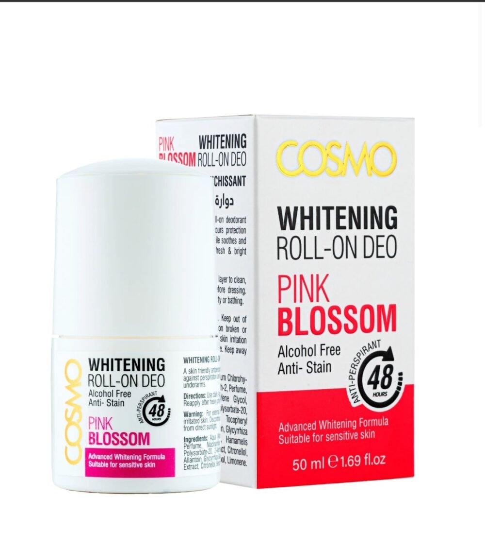 COSMO Whitening Roll-On (Pink Blossom) – Deodorant 48Hr Anti-Perspirant (1.69 oz / 50ml) Floral, fresh, and fabulously effective—this Pink Blossom variant is your go-to companion for all-day freshness and gentle skincare. It’s where elegance meets everyday comfort, wrapped up in a charming scent that feels like springtime on your skin. 💗 Why You’ll Love It 48-Hour Protection from odor and perspiration—perfect for long days or warm climates Whitening Formula to help reduce underarm pigmentation over time Fast-Drying Texture that glides on smoothly and doesn’t stain clothes Pink Blossom Fragrance offers a soft, feminine scent with floral notes that linger beautifully Skin-Friendly Formula suitable for sensitive underarms