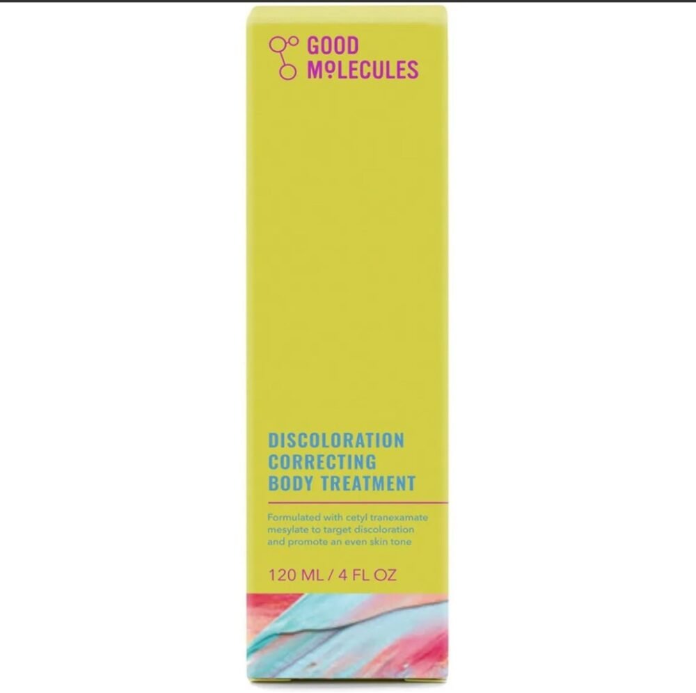 The Good Molecules Discoloration Correcting Body Treatment 120ml is a hydrating body moisturizer designed to improve the appearance of dark spots, age spots, hyperpigmentation, sun damage, and uneven skin tone. Here are its key features and benefits: *Key Ingredients:* – *2% TeraCeutic TXVector (cetyl tranexamate mesylate)*: Delivers tranexamic acid deep into the skin to help fade hyperpigmentation. – *Aspergillus and Saccharomyces Ferments*: Help soothe, moisturize, and brighten the skin. – *Niacinamide, Arginine, and Jojoba Seed Oil*: Support hydrated, healthy-looking skin. – *Capryloyl Salicylic Acid (LHA)*: Exfoliates dead skin cells for smoother skin. *Benefits:* – *Fades Dark Spots*: Effectively targets hyperpigmentation, post-acne scars, and sun spots. – *Hydrates Skin*: Provides long-lasting hydration for a softer, more radiant complexion. – *Suitable for All Skin Types*: Gentle and non-irritating, making it perfect for sensitive skin. *How to Use:* – Apply to areas of concern in the morning and at night. – Avoid direct eye contact