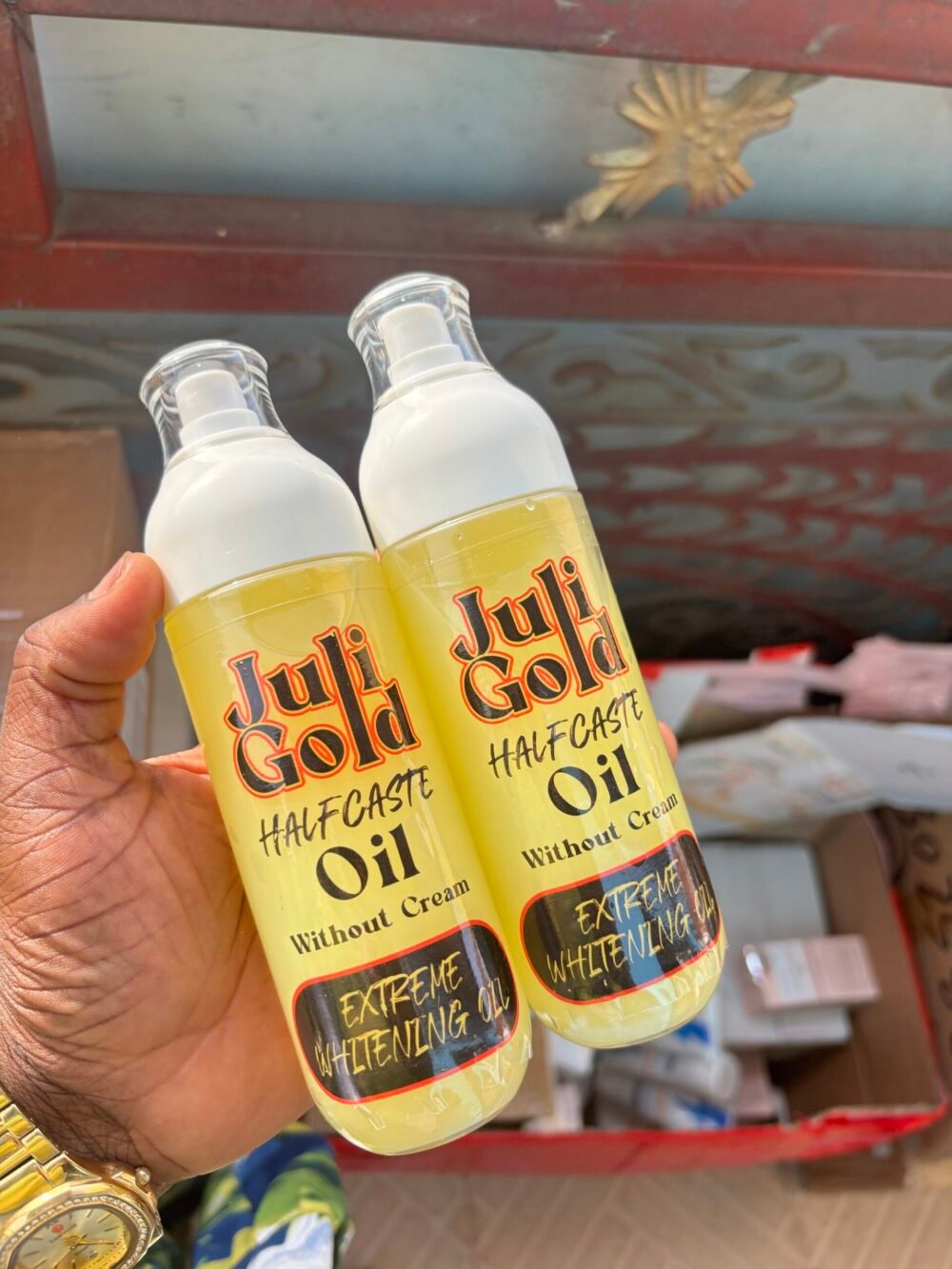 Juli Gold Whitening Oil is described as a powerful, fast-absorbing, half-cast oil designed for extreme skin whitening and a radiant, glowing complexion, often used directly on the skin without additional creams to fade dark spots, uneven tone, and blemishes while promoting a smooth, hydrated, and soft texture. It targets areas like knuckles, elbows, and inner thighs, providing a lightweight, non-greasy feel and enhancing overall skin radianceBest skincare store in Lagos