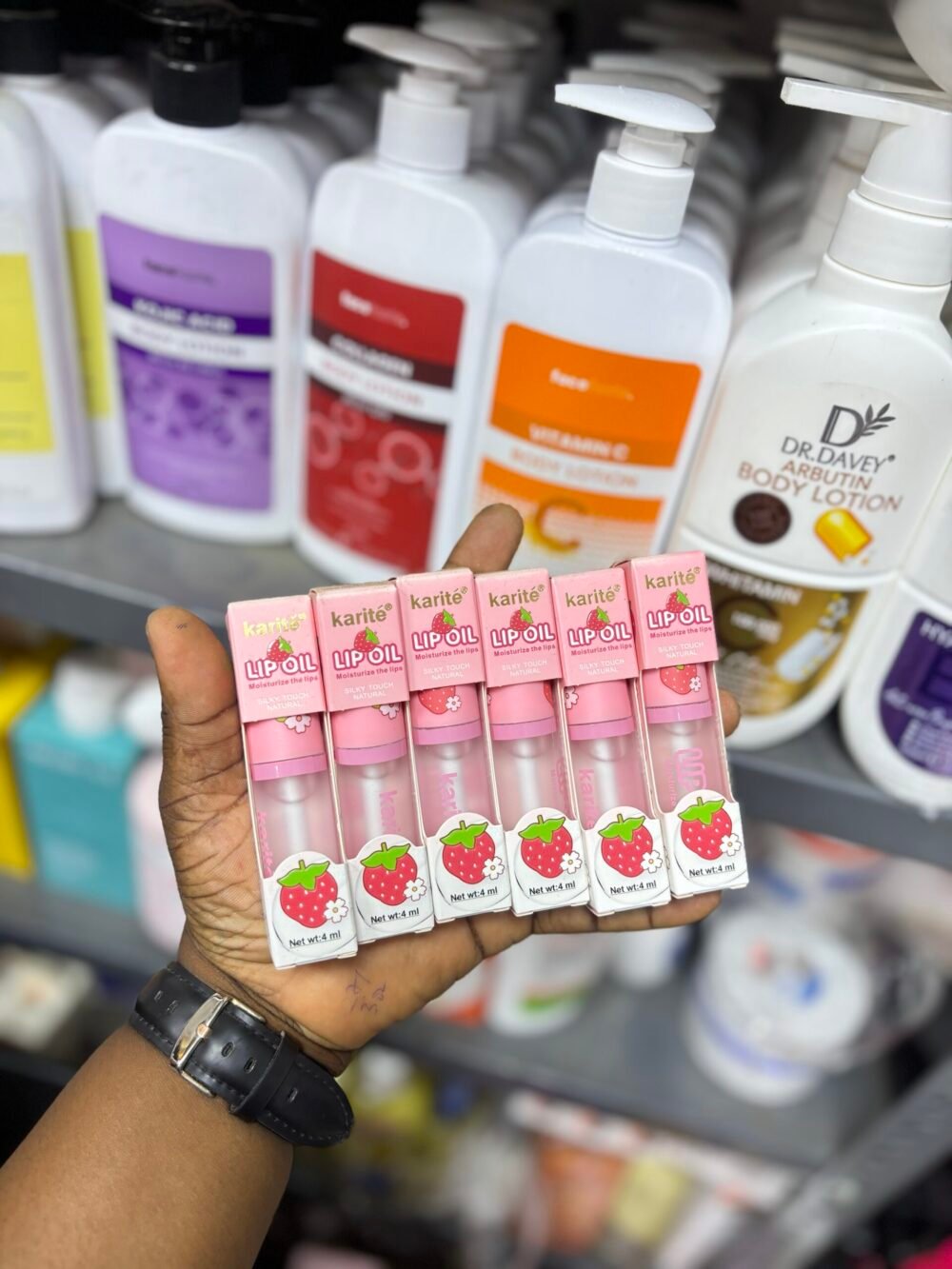Karite Strawberry Lip Oil is a hydrating lip care oil infused with the sweet essence of strawberry. Its smooth, non-sticky formula glides on easily, moisturizing and softening dry lips while adding a glossy finish. Enriched with nourishing ingredients, it helps lock in moisture, leaving lips supple, refreshed, and healthy-looking. Perfect for daily use, it combines fruity freshness with lasting lip care and shine. where you can buy the best skin care in lagos state