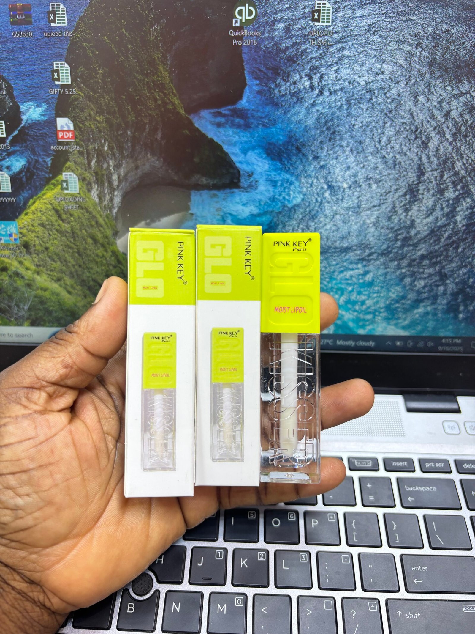 “PINK KEY® GLO KISSER” which appears to be a lip product, likely a lip gloss or balm, given the name “GLO KISSER” and the “MOIST LIPS” text on the packaging.