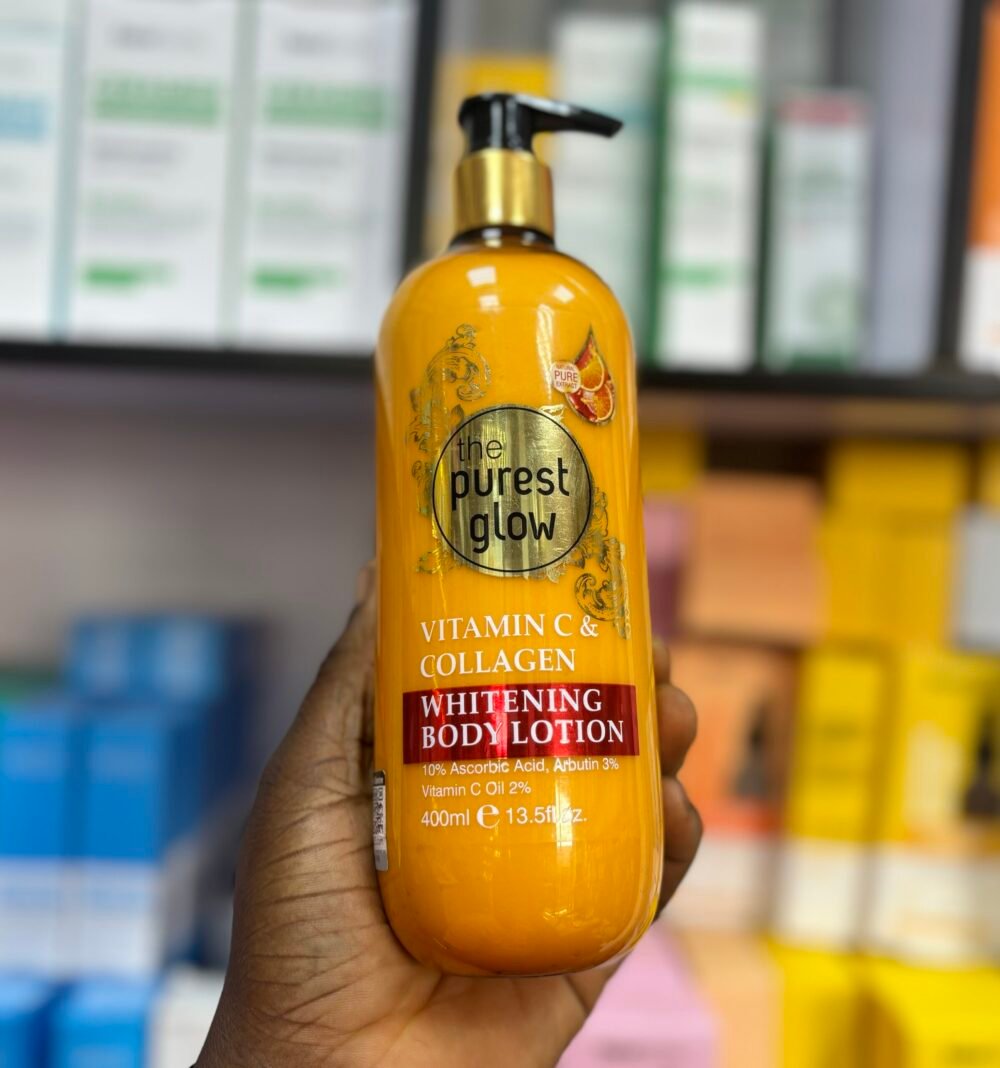 The Purest Glow Vitamin C & Collagen Whitening Body Lotion is a skincare product designed to smoothen, whiten, and brighten the skin. It contains Vitamin C to fight free radicals and boost collagen, which helps keep the skin plump and youthful. The lotion aims to heal dry, rough, and dull skin, reduce dark spots, and promote an even skin tone for a gentle, tender, and radiant appearance. Available at Gifty beauty store in Lagos