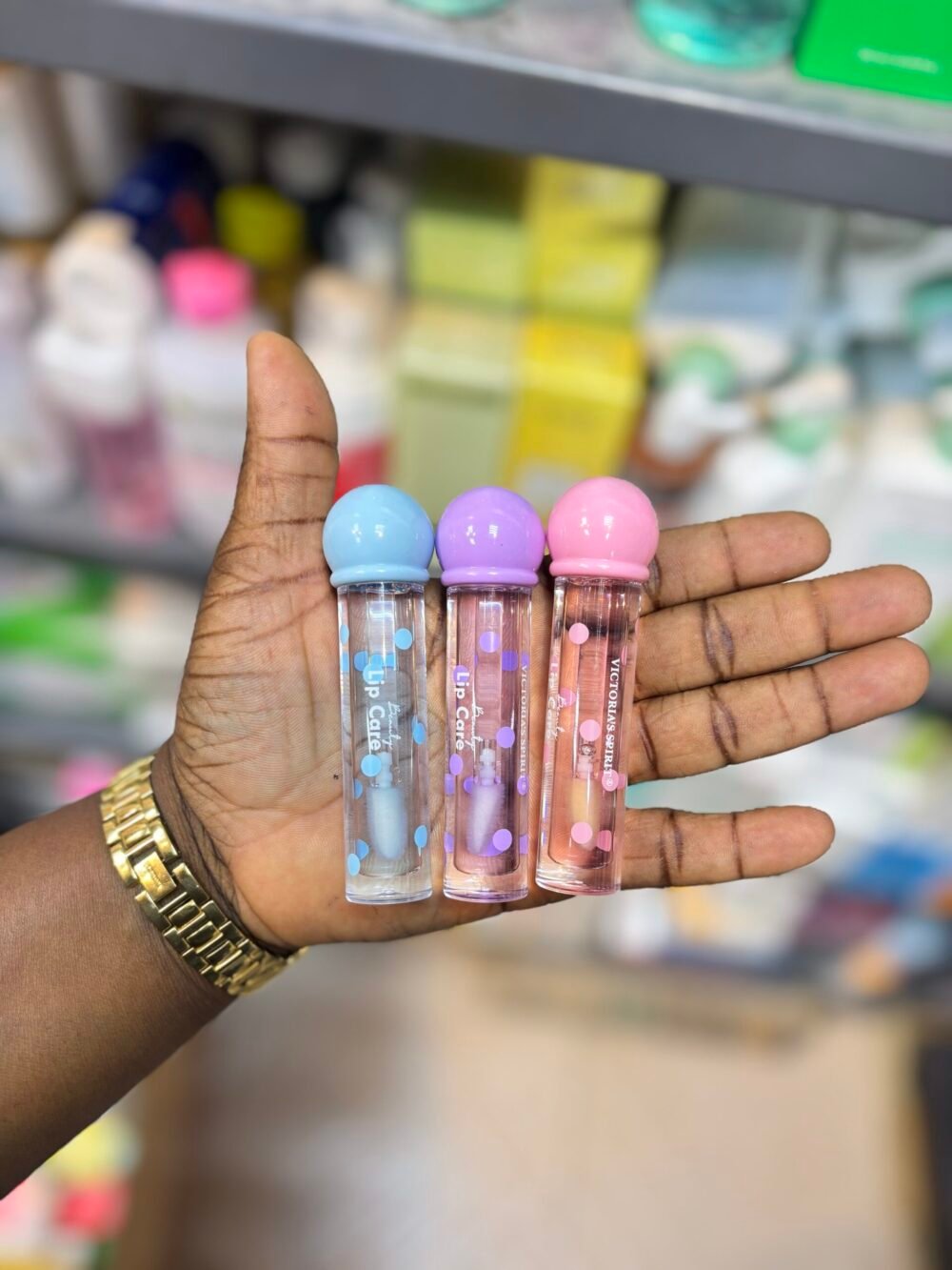 It comes in a transparent cylindrical tube with a purple polka-dot design and a matching round purple cap. The container has a sleek, glossy look, making it easy to carry in a purse or pocket. Based on its appearance, it is a lip care oil or lip gloss designed to moisturize, nourish, and add shine to the lips while keeping them soft and hydrated. where you can buy the best skin care in lagos state